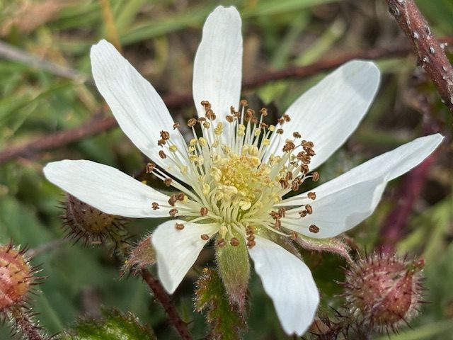 Because of the cool and wet late winter this year, and the cold ocean temperatures the native flowers on Wave Cut Ranch are a bit delayed blooming. We are keeping a watchful eye on our Douglas iris patches, and for early-bird Cal poppies. Meanwhile, the native California blackberry ground hugging vines have been blooming with beautiful small white rose family blossoms, sustaining the first bumble bees to cruise the pastures and meadows here.