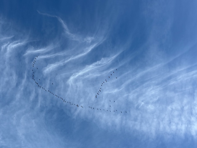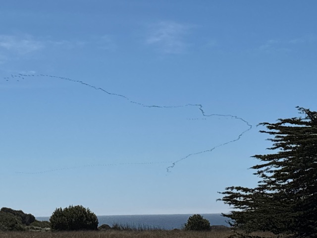 For the past couple of weeks humongous and majestic trailing flocks of migrating Aleutian cackling geese have been passing over the Mendocino coast on their route to breeding grounds in the Aleutian Islands off western Alaska. On very windy days they skim the surface of the ocean, but usually pass high overhead, some of the breathtaking snaking V-shaped flocks numbering over 600 individuals. We hear their distinct sky-chatter approaching high overhead before we see them – like the crowd noise from an open air stadium in the sky.